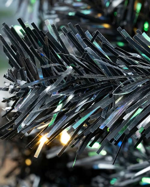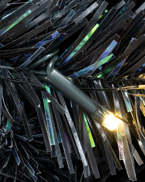 This pre-lit Black Iridescence Christmas tree offers a distinct, contemporary aesthetic for festive displays. Its full, dense foliage incorporates unique clear iridescent film strips, providing an elegant dark green shimmer. Integrated warm white lights ensure a consistent, enchanting glow throughout the tree. This eye-catching design serves as a sophisticated focal point, enhancing any chosen Christmas decorations.